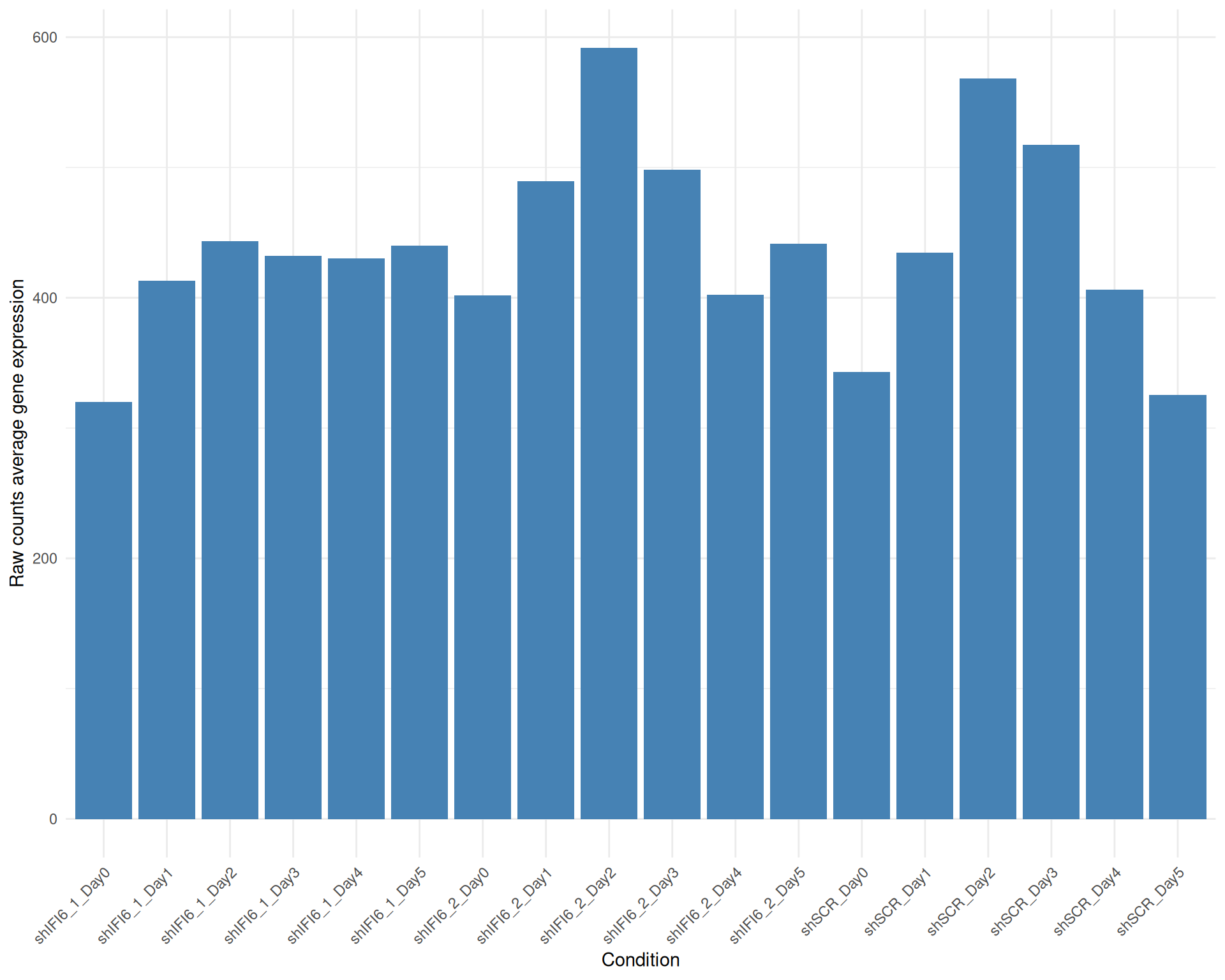 Below we present the distributions of the selected genes expression across conditions in a barplot where the height of each bar represents the average expression of all the selected genes in that particular condition. Each condition includes all the available replicates except those already filtered.