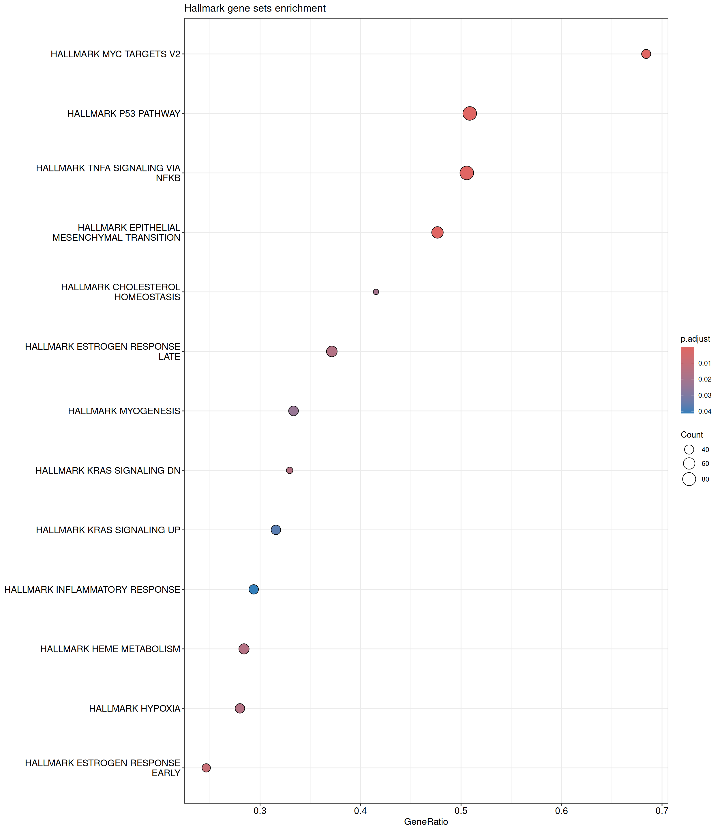 GSEA is performed using the Hallmark gene sets, which represent well-defined biological states and processes. The dot plot below displays all enriched Hallmark pathways. The size of each dot corresponds to the number of differentially expressed genes contributing to each pathway. Additionally, the color of each dot indicates the significance of the pathway’s enrichment, emphasizing its relative importance.