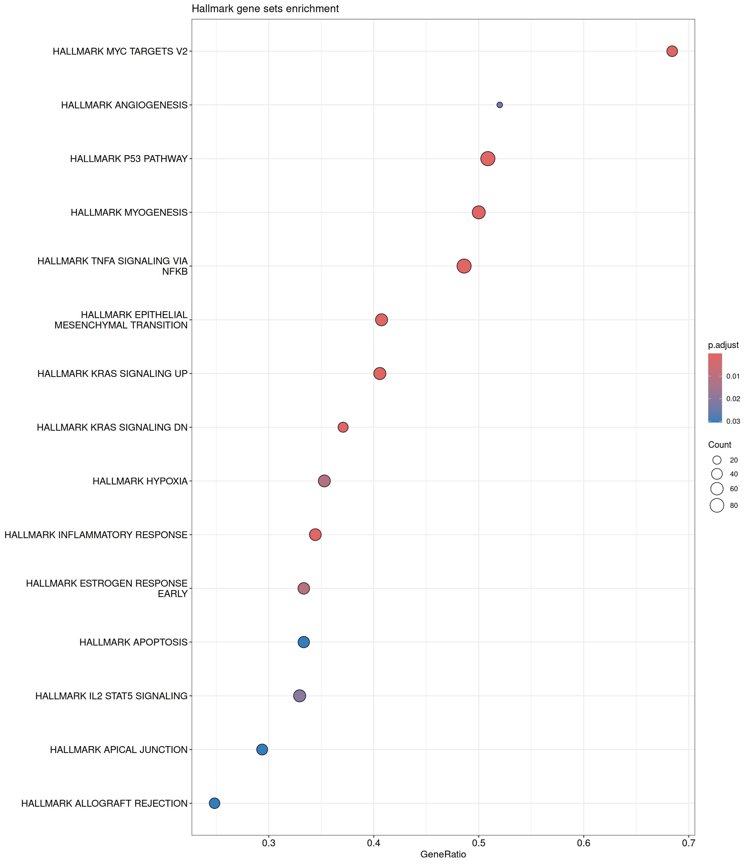 GSEA is performed using the Hallmark gene sets, which represent well-defined biological states and processes. The dot plot below displays all enriched Hallmark pathways. The size of each dot corresponds to the number of differentially expressed genes contributing to each pathway. Additionally, the color of each dot indicates the significance of the pathway’s enrichment, emphasizing its relative importance.